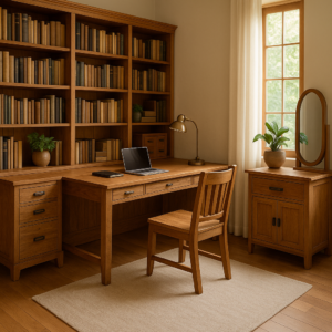 ห้องทำงานที่ตกแต่งด้วย เฟอร์นิเจอร์ไม้สัก จะช่วยสร้างบรรยากาศที่น่าทำงานและกระตุ้นความคิดสร้างสรรค์